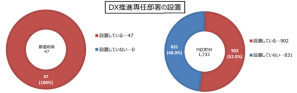自治体DXの推進状況についてまとめられた総務省の調査結果『自治体DX・情報化推進概要』によると、DX推進専任部署を設置している都道府県は全団体となっている一方、市区町村は902団体と全体の52.0%になっています。