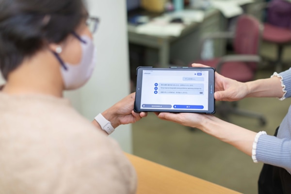 多言語通訳サービスは、外国人との対面でのコミュニケーションを支援するサービスです。タブレットまたは専用機器に音声を入力すると、設定した外国語に翻訳された音声・テキストが出力される仕組みとなります。